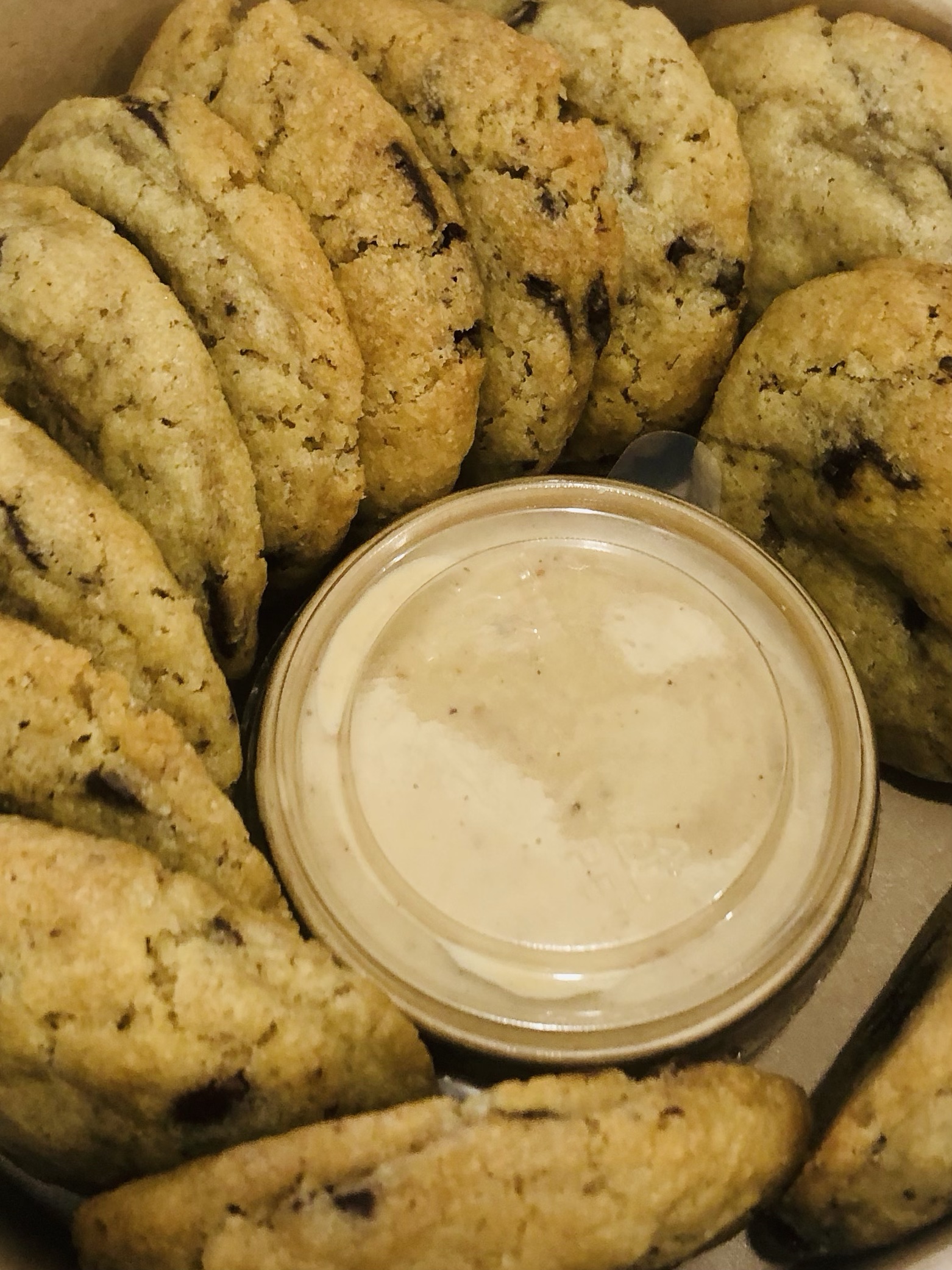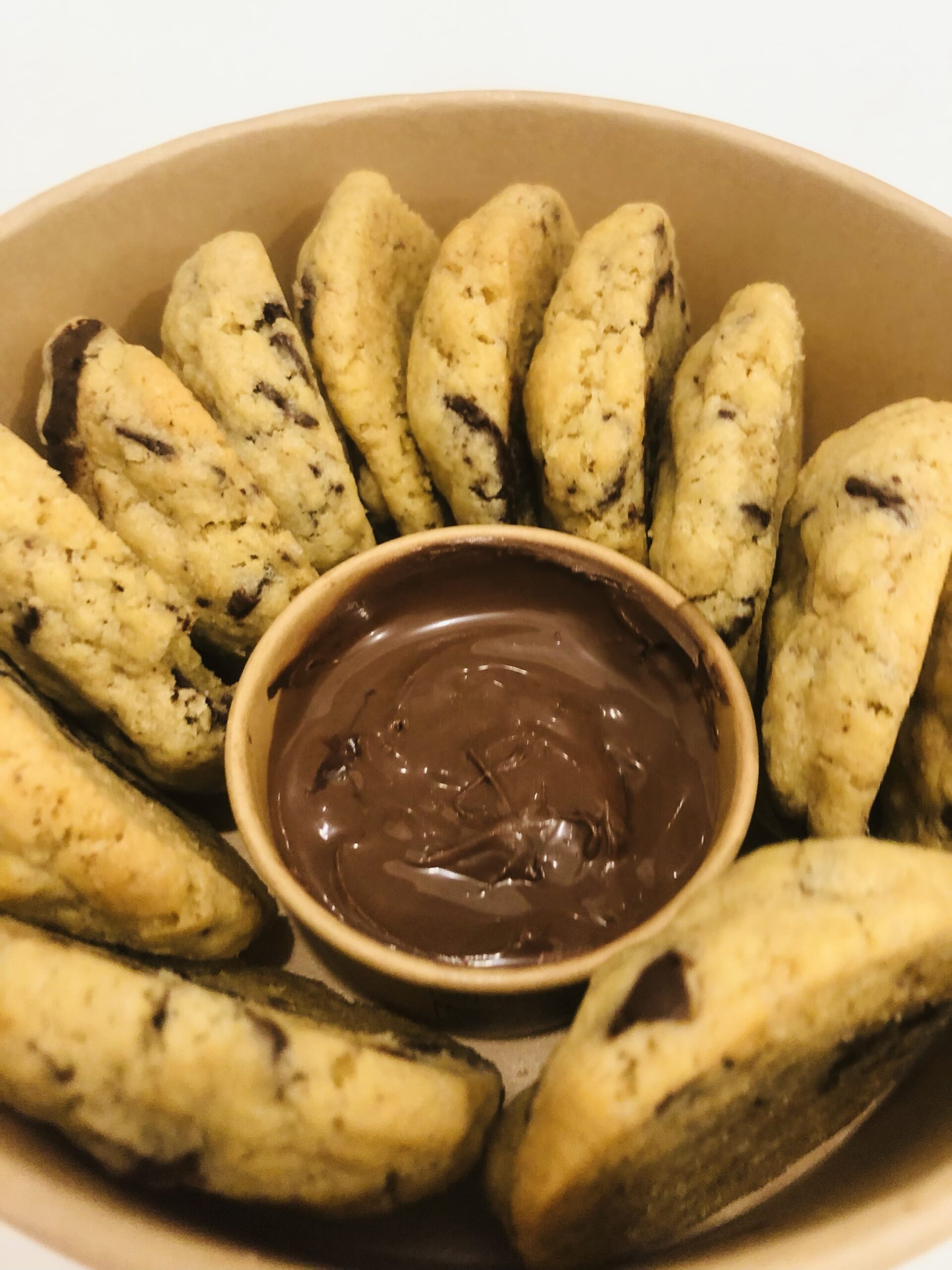 Découvre notre box de 12 minis cookies chocolat noir (à partager ou pas😜) accompagné de sa sauce au choix : Nutella, Bueno ou caramel beurre salé.